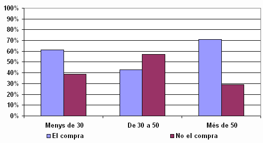 Per grups d’edat, el comprador en català és molt madur, amb una mitjana d'edat de 47 anys. És a dir, un 50 per cent de compradors de premsa catalana tenen més de 47 anys. Per contra, la premsa esportiva és d'audiència molt jove, amb una mitjana de 29 anys, per tant, el 50 per cent de lectors de premsa esportiva tenen menys de 29 anys.